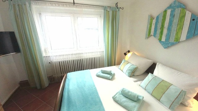 Ferienwohnung ca. 75 qm für 5 Personen im Erdgeschoss mit eigener Sitzecke im Garten. 2 Schlafzimmer, 1 Elternschlafzimmer mit TV, 1 Kinderzimmer mit Etagenbett und einem Einzelbett. Separate Küche, Wohnzimmer mit separate Essecke, 2 Duschbäder, 1 kostenloser PKW-Stellplatz auf dem Grundstück.
