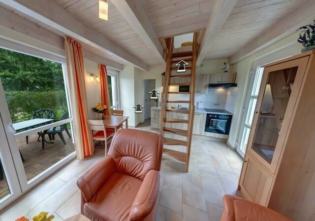 2 Etagen, ca. 54 m² (4 Personen) Zur Ausstattung gehören ein Schlafzimmer mit Doppeltbett und ein Schlafzimmer mit 2 Einzelbetten. Zur weiteren Ausstattung gehören ein Wohnzimmer mit integrierter vollausgestatteter Küche (Geschirrspüler, Ceranherd mit Backofen, Mikrowelle, Kaffeemaschine) einem Bad mit Dusche/WC und einer großen Terrasse mit Sitzmöglichkeiten.